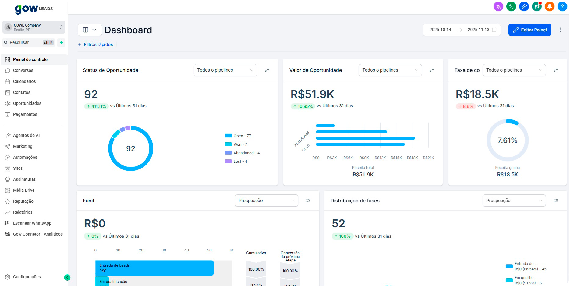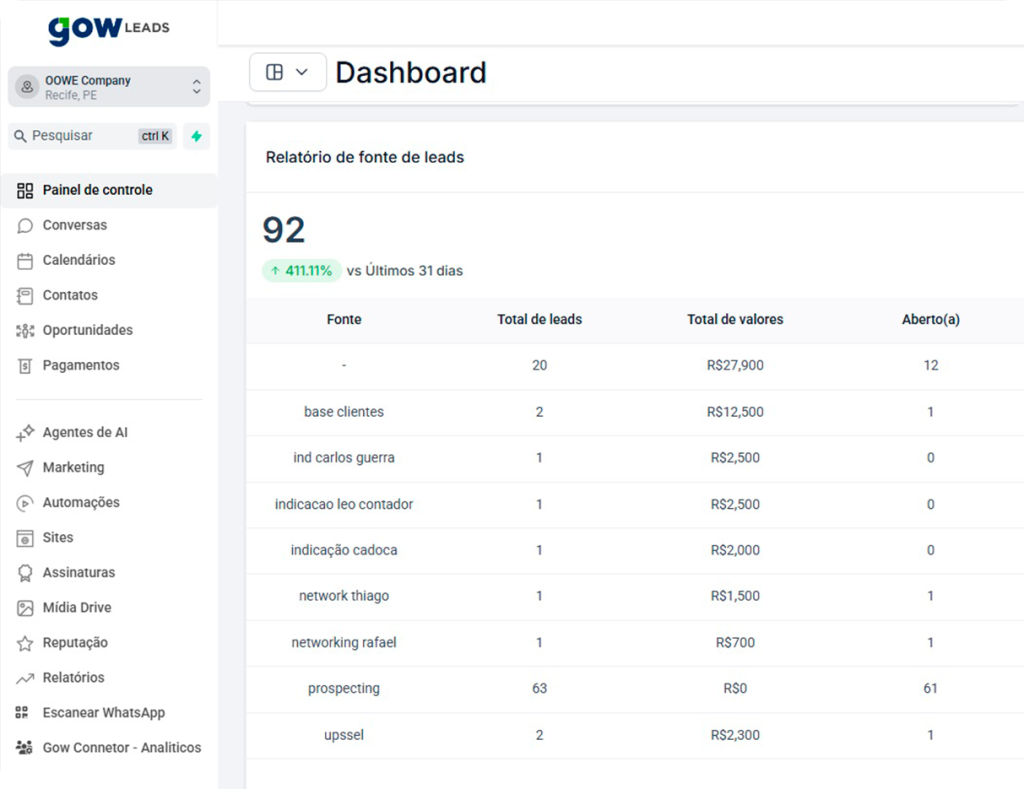 Como a GOW Leads centraliza tudo (CRM, Atendimento, E-mail), nossos relatórios conectam os pontos. Veja a jornada do cliente do primeiro clique à venda final.